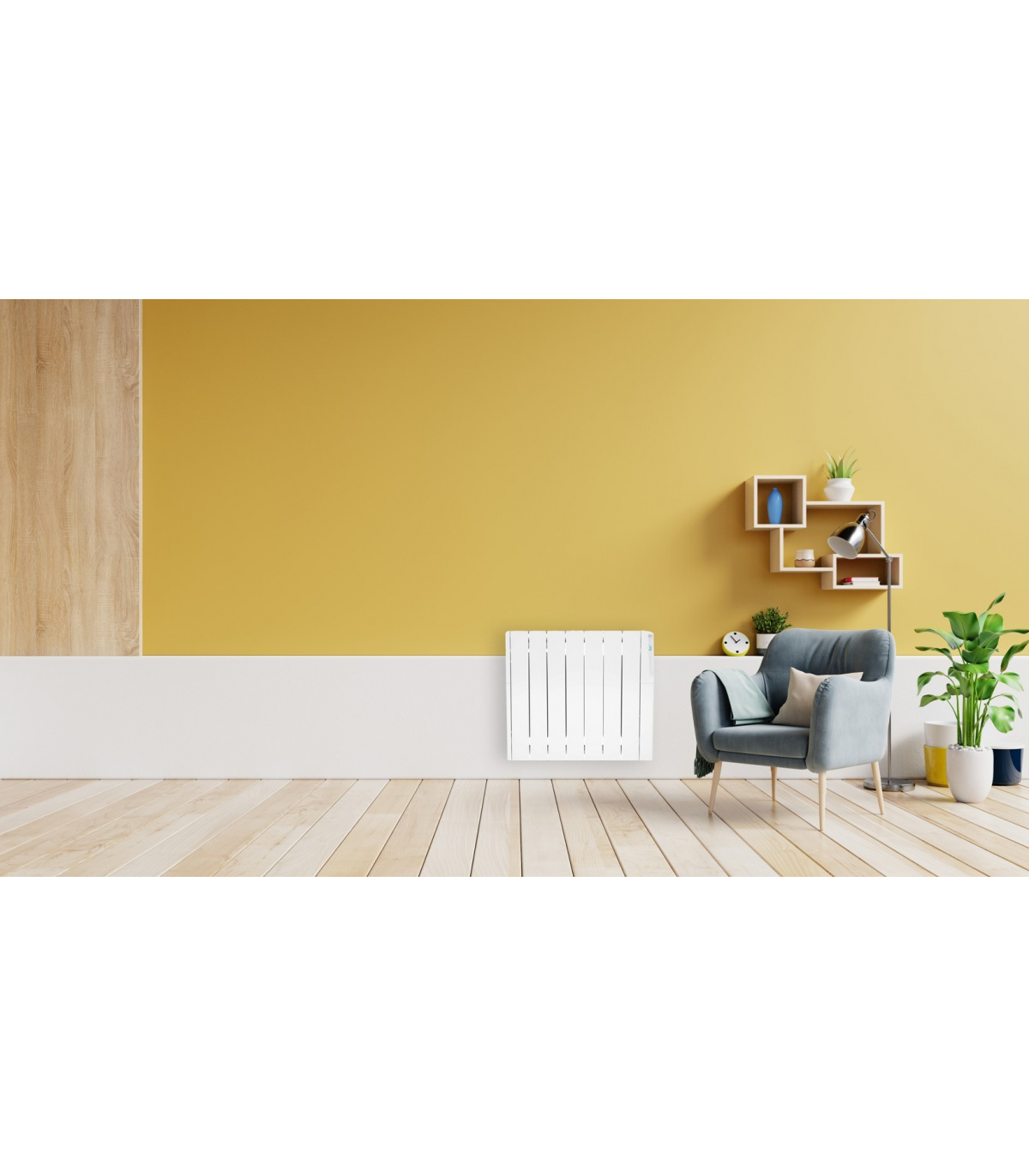 Emisor fluido WiFi 500W. Control desde smartphone, programación personalizada, Alexa/Google, modos confort/eco/antihielo, geolocalización y control inteligente.