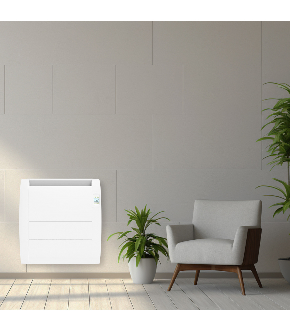 Emisor seco con diseño slim (6 cm), programación 24/7, PID, baby-care, modos eco/confort, bloqueo, control de consumo y extrasilencioso. Fabricado en España.