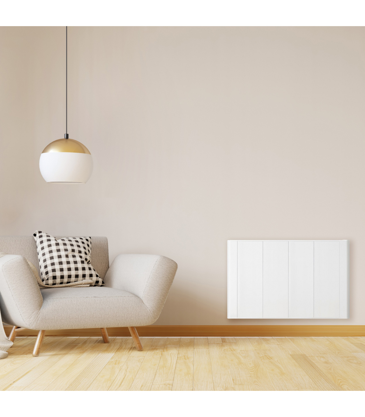 Emisor seco 1500W ultrafino de 5 cm, elegante, eficiente y extrasilencioso. Programable 24/7 con PID, baby-care y más. Incluye bases y soportes. Fabricado en España.