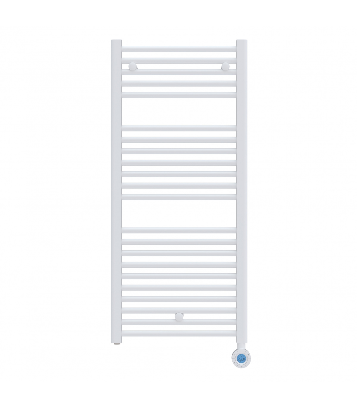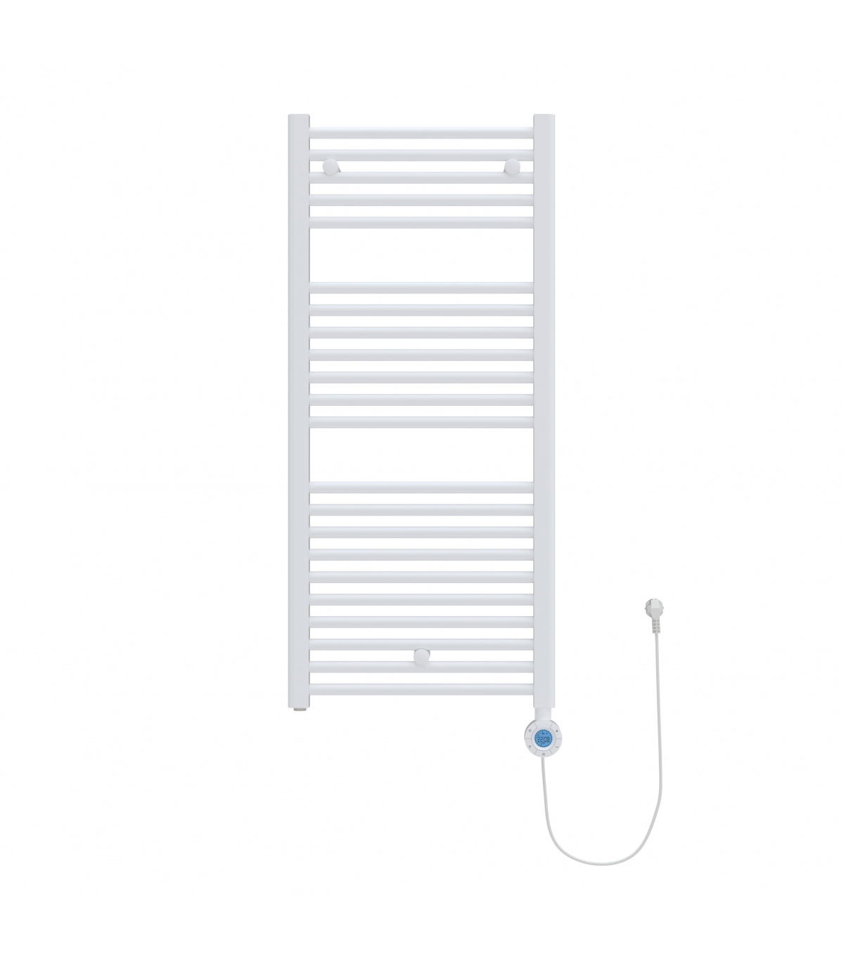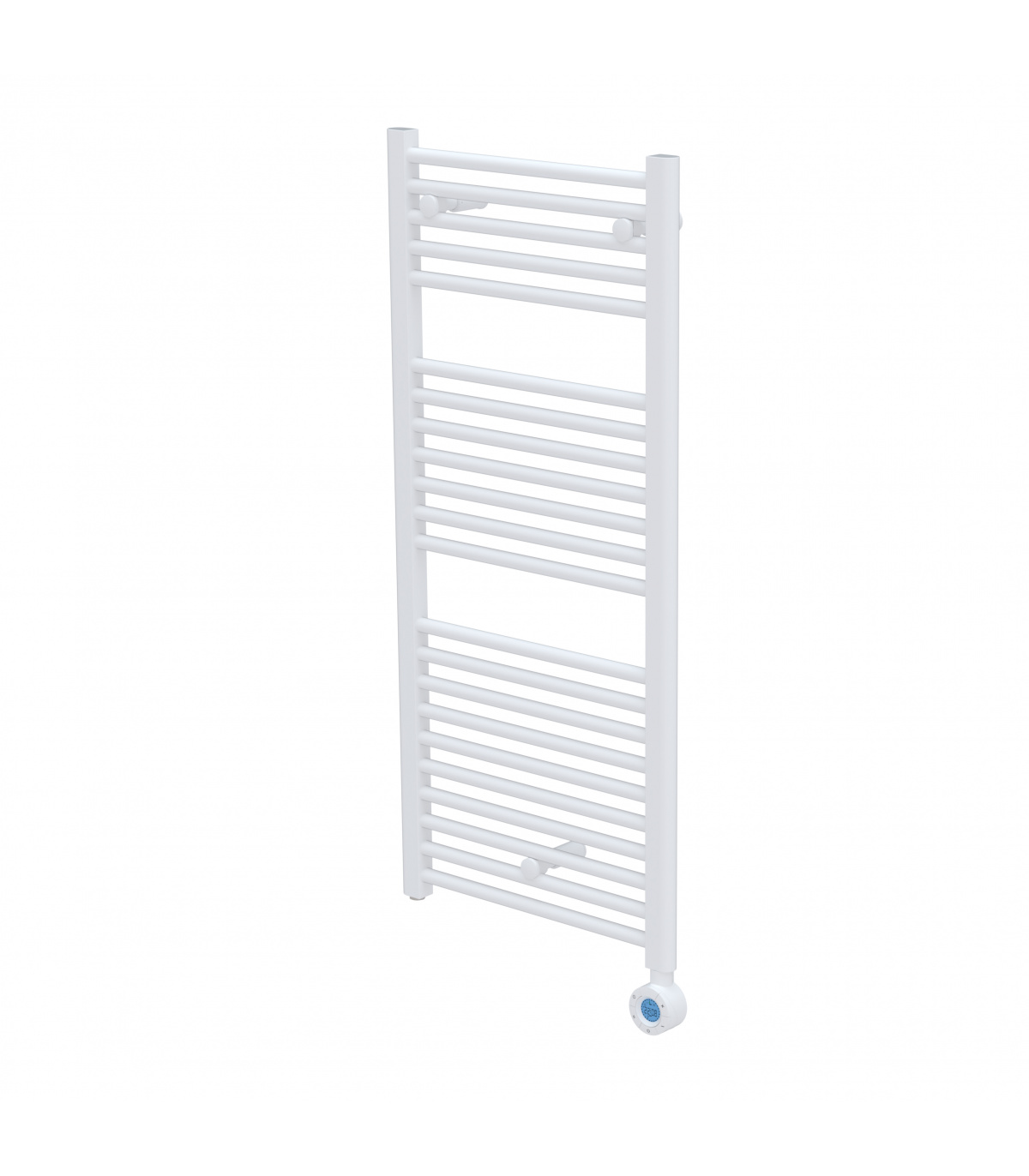Radiador toallero eléctrico fluido blanco programable con bastidor de acero, termostato para regular la temperatura y pantalla LCD.