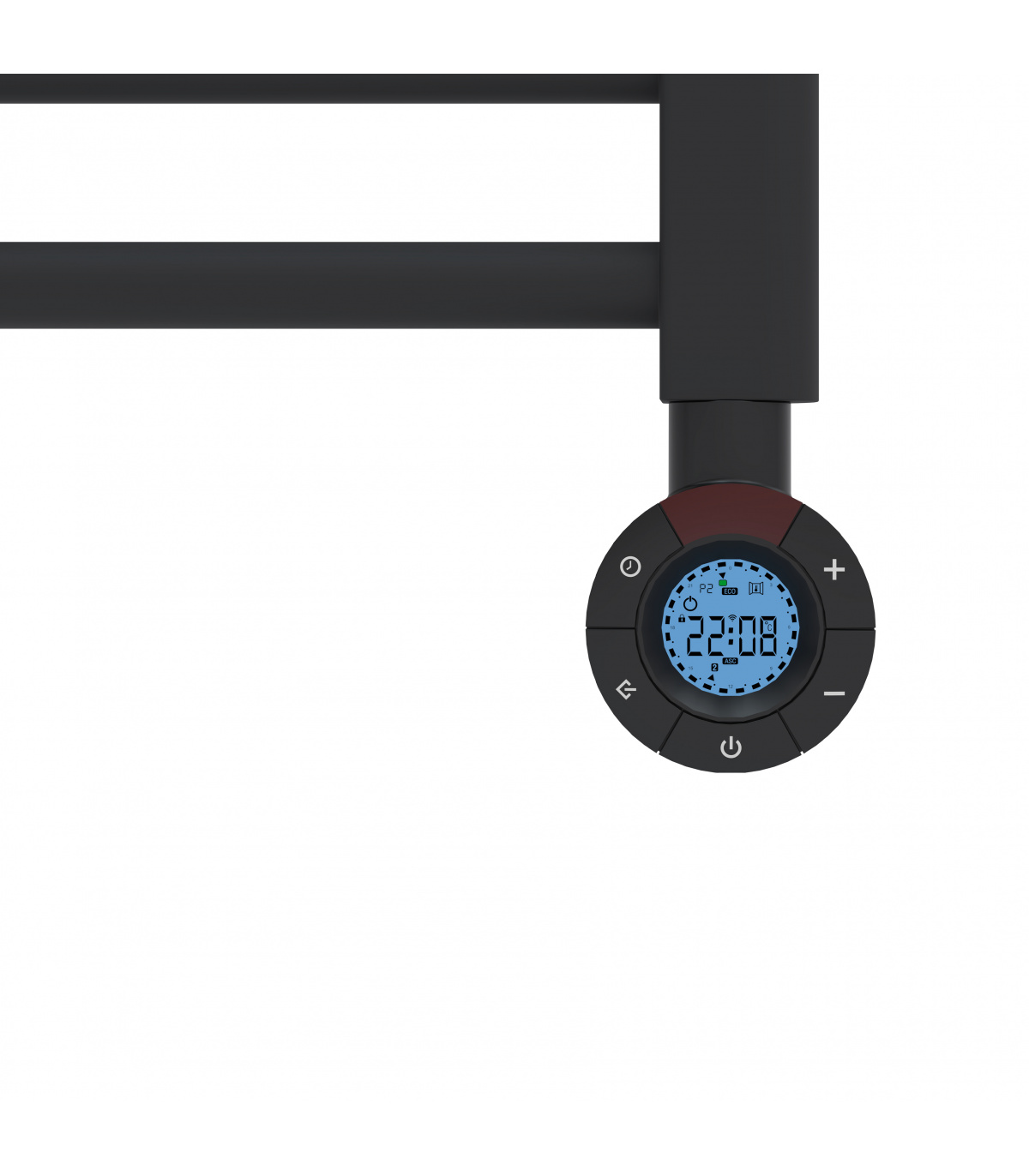 Radiador toallero en acero con fluido caloportador de máximo rendimiento y seguridad. Control electrónico de fácil manejo con función on/off, boost 2h, temporizador 12h y 24h.