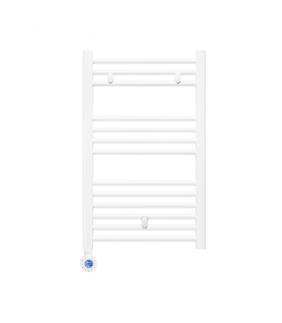 Radiador toallero eléctrico fluido blanco programable con bastidor de acero, termostato para regular la temperatura y pantalla LCD.