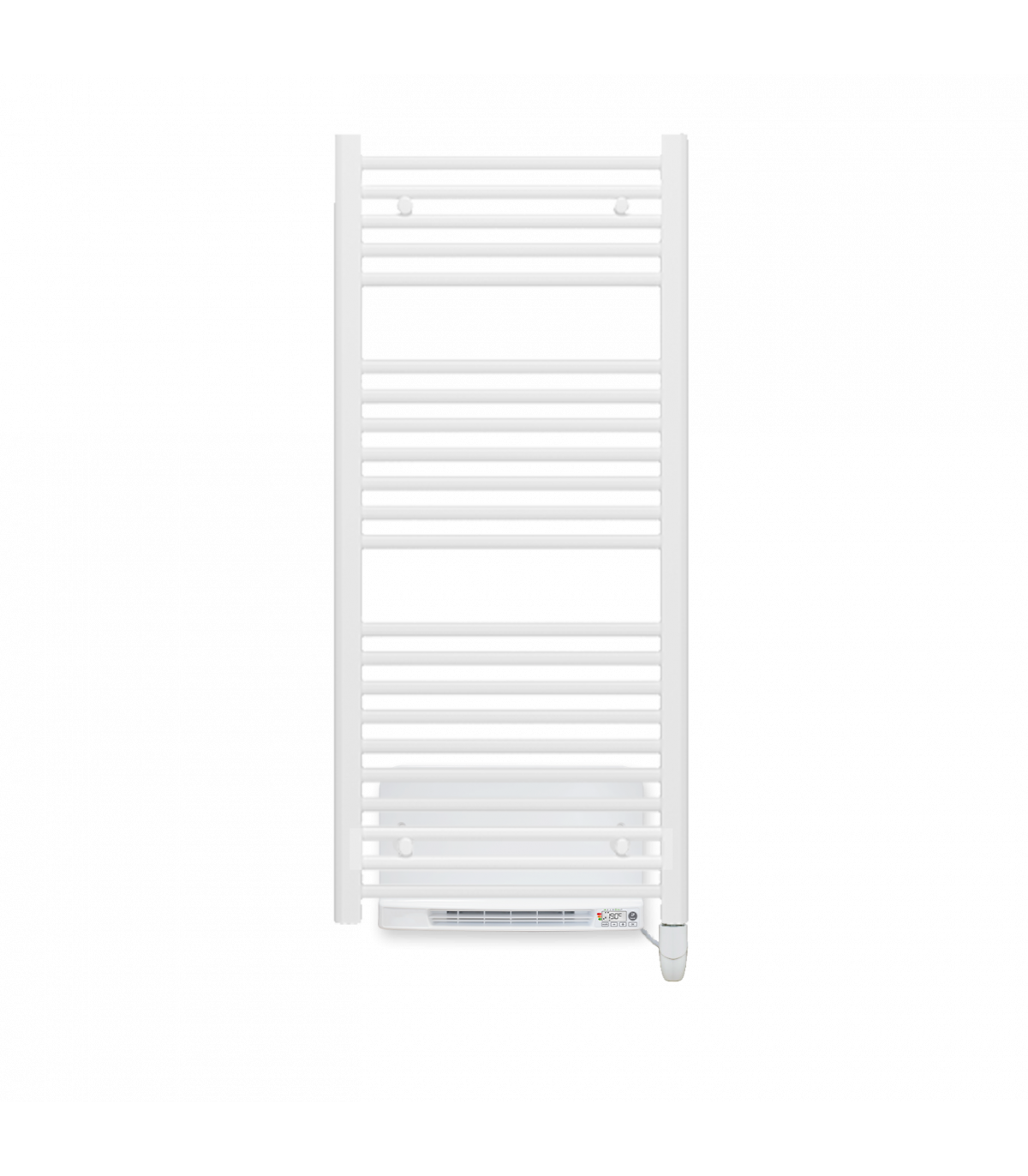 Radiador toallero eléctrico fluido blanco programable con bastidor de acero, termostato para regular la temperatura y pantalla LCD.