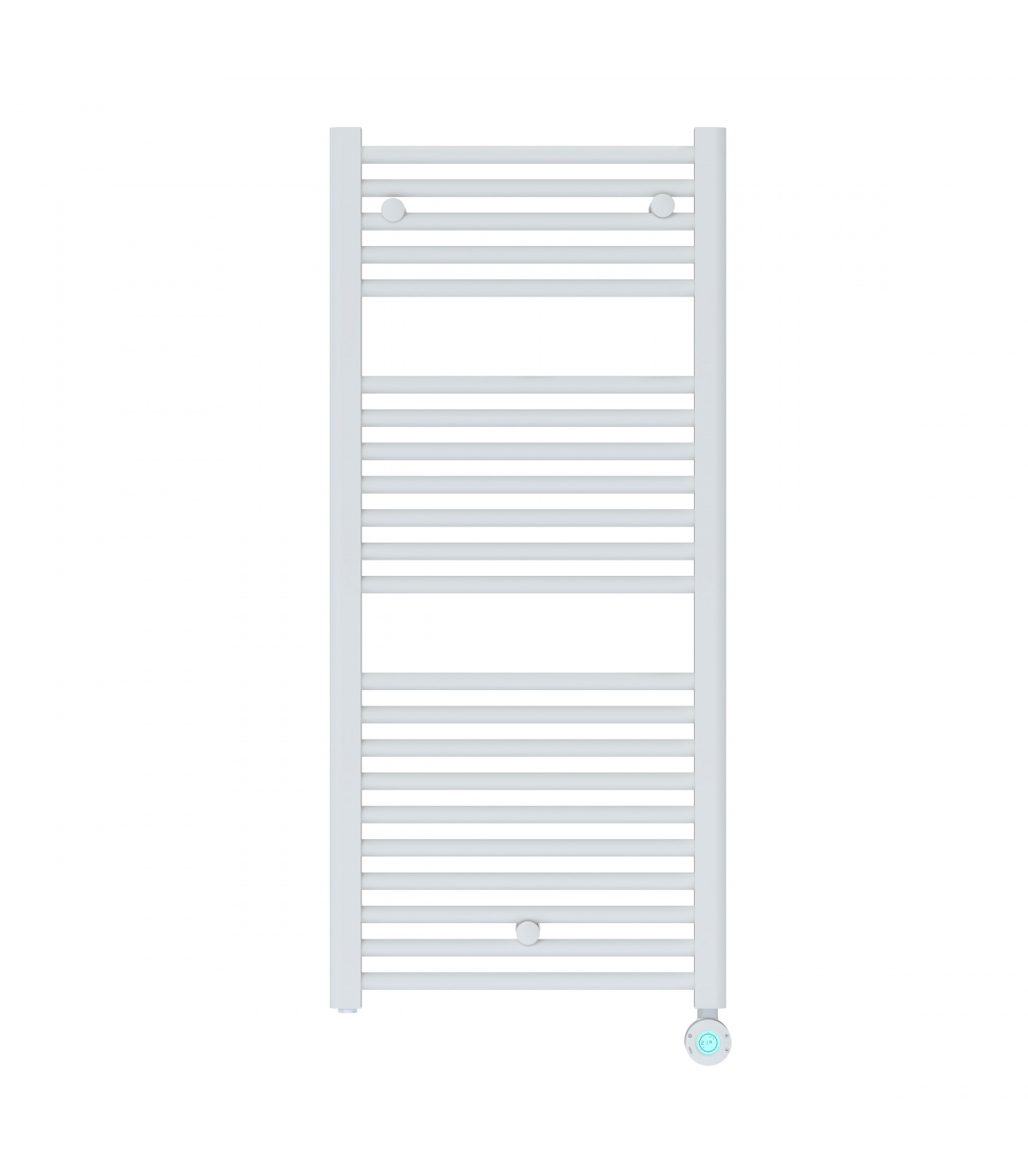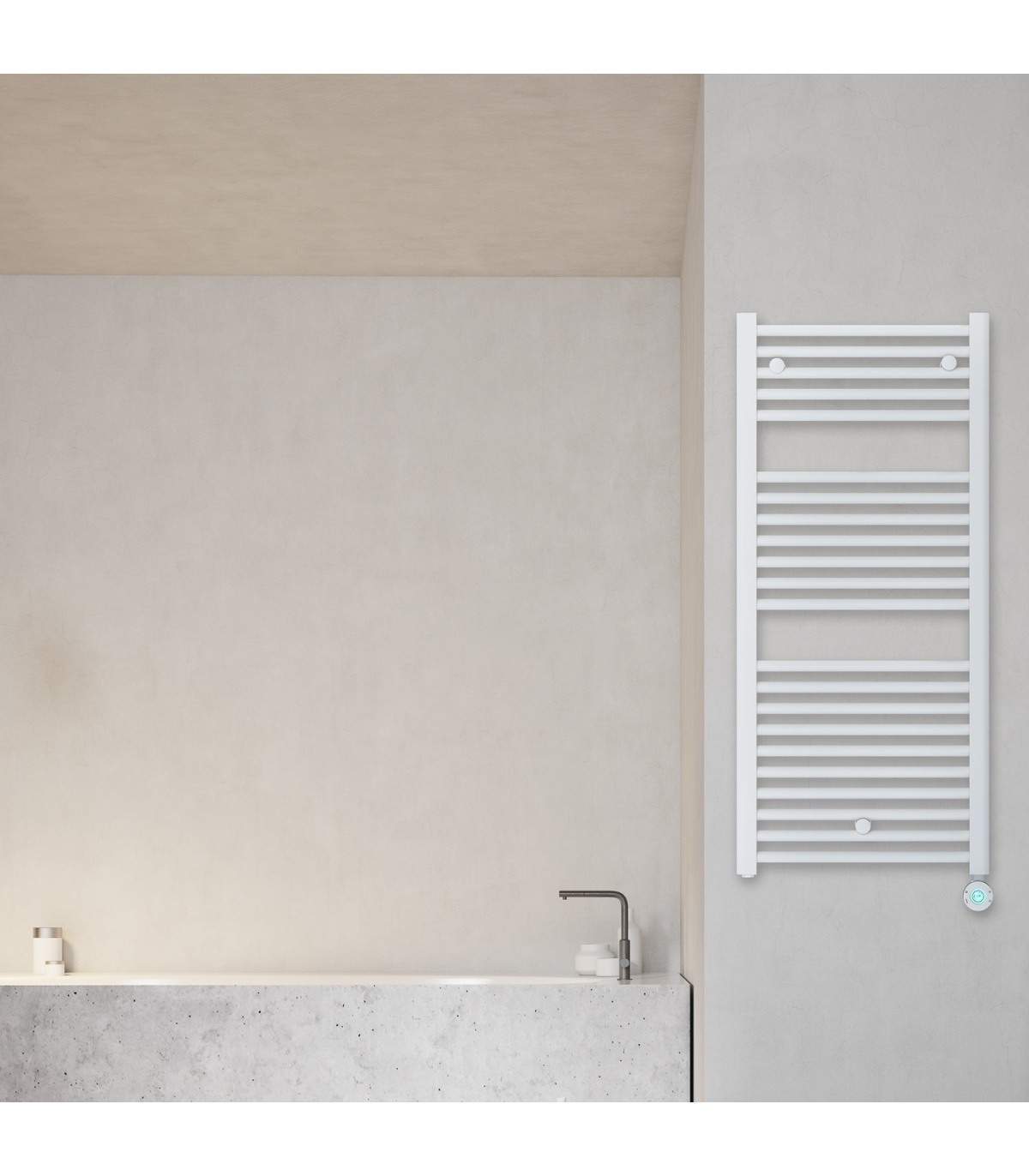 Toallero eléctrico blanco, fluido de alto rendimiento, control digital programable, modos inteligentes, seguridad IP44. Diseño recto. Fabricado en España.