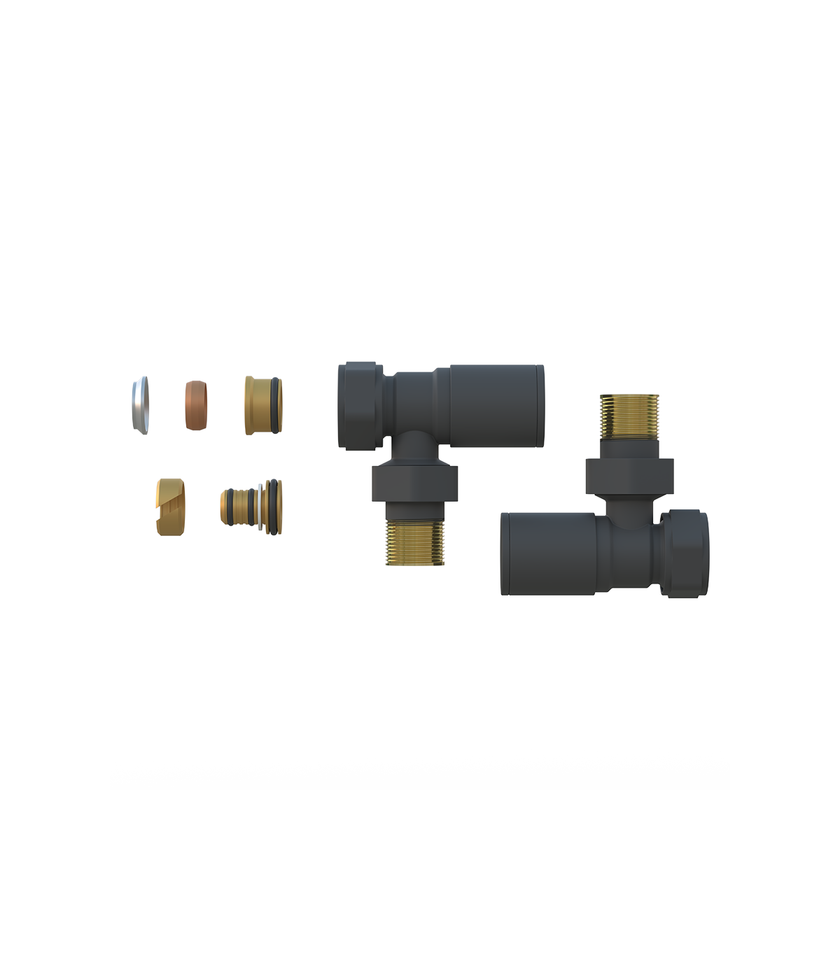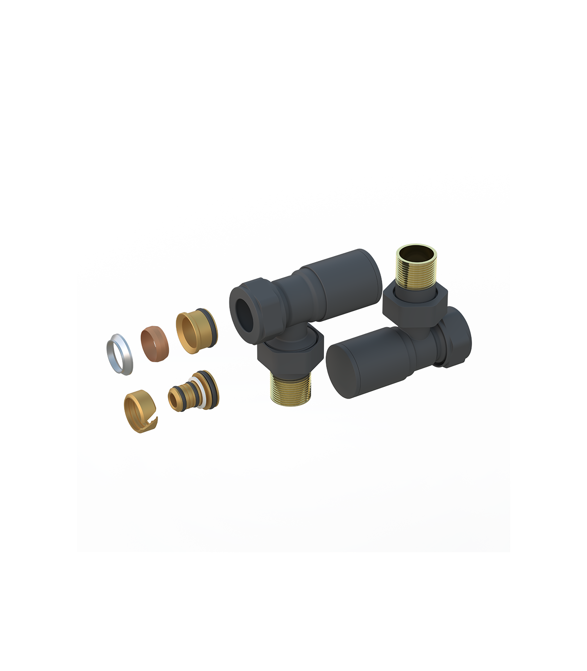 Kit válvulas negro 1/2" con adaptadores para tubo de cobre Ø15 y multicapa Ø16x2mm. Ideal para instalaciones eficientes y seguras.