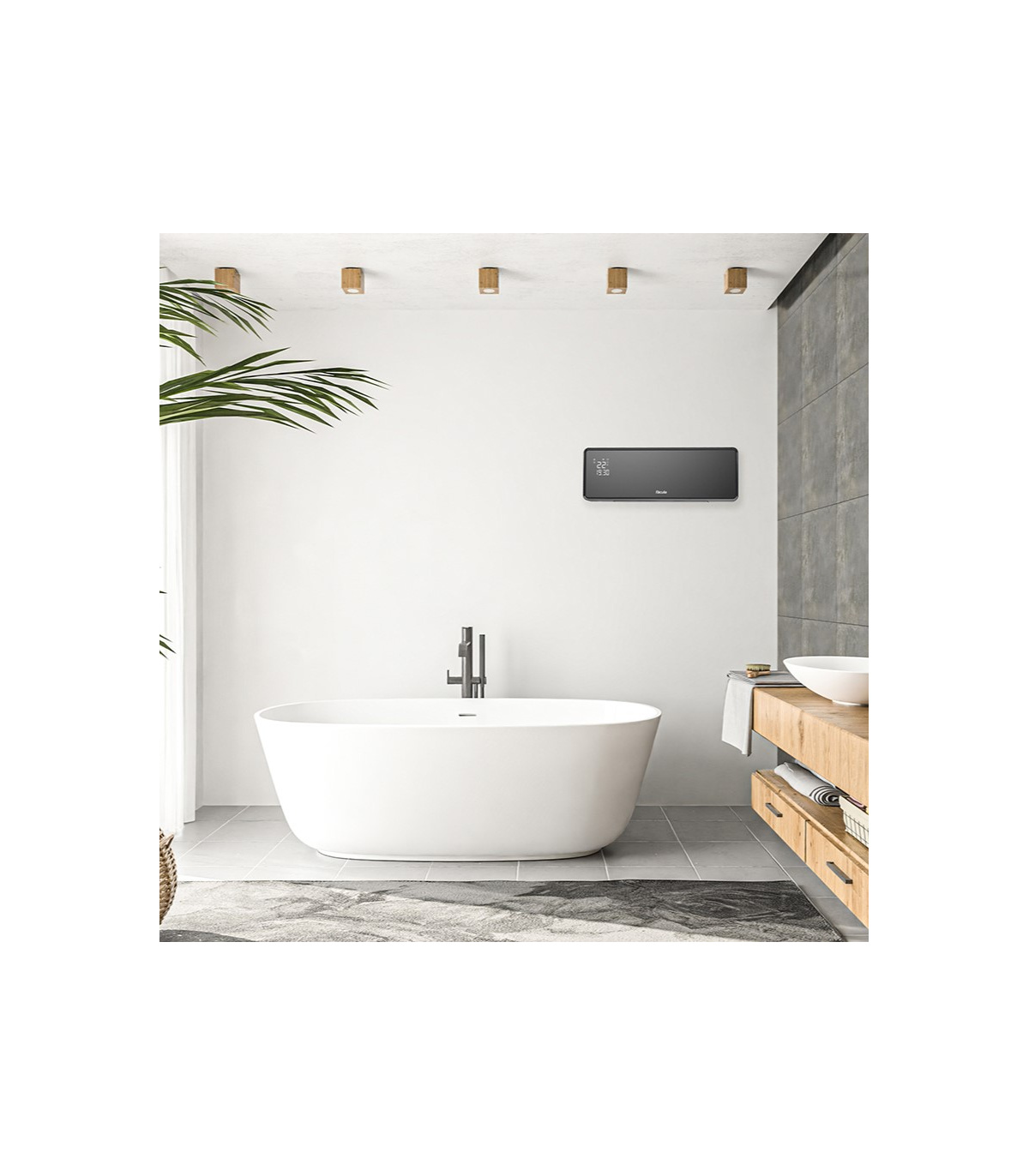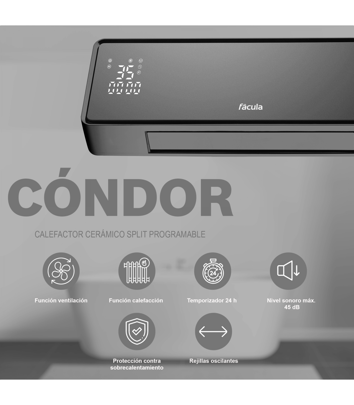 Calefactor cerámico split con termostato, 2 niveles de calor, protección contra sobrecalentamiento y función aire frío.