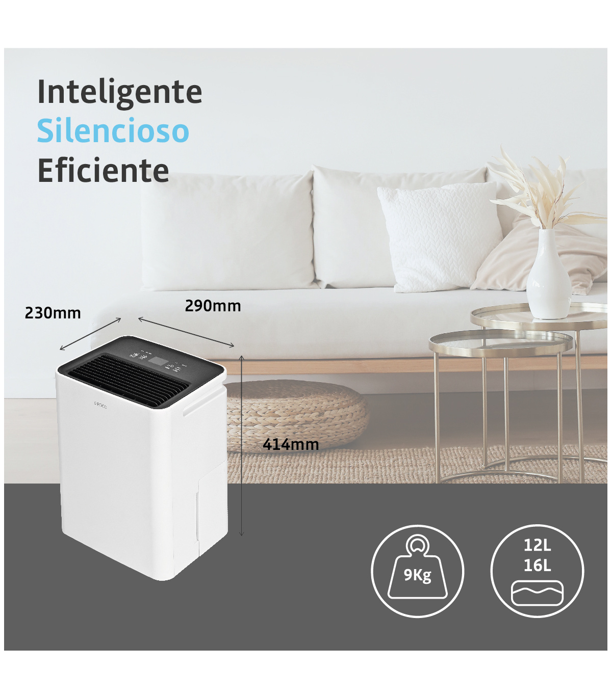 Deshumidificador portátil con modo auto, drenaje continuo, temporizador, filtro lavable, pantalla LED y gas R290. Silencioso y fácil de mover.