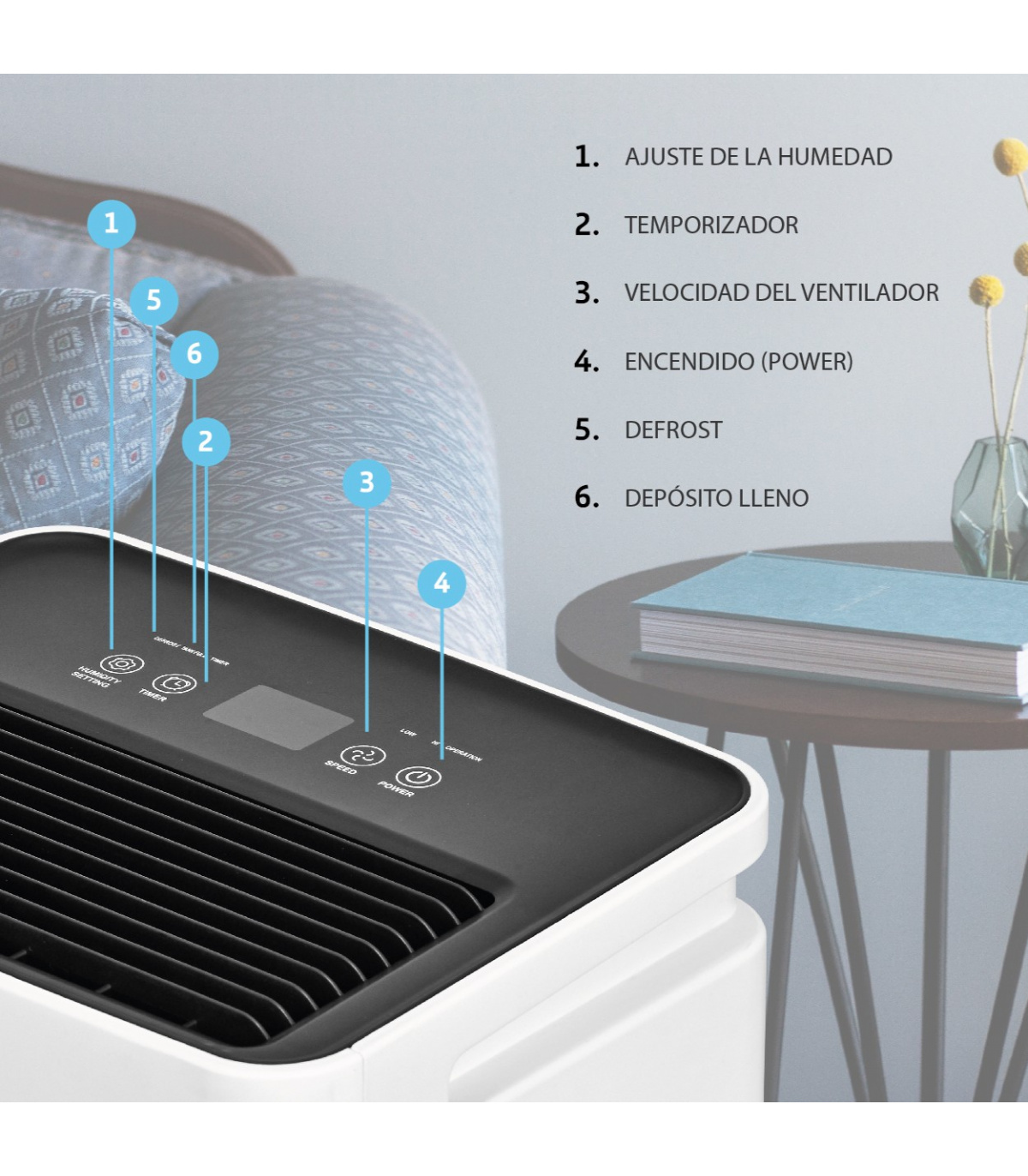 • Deshumidificador portátil con control de humedad.