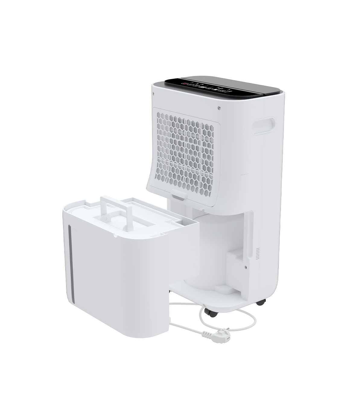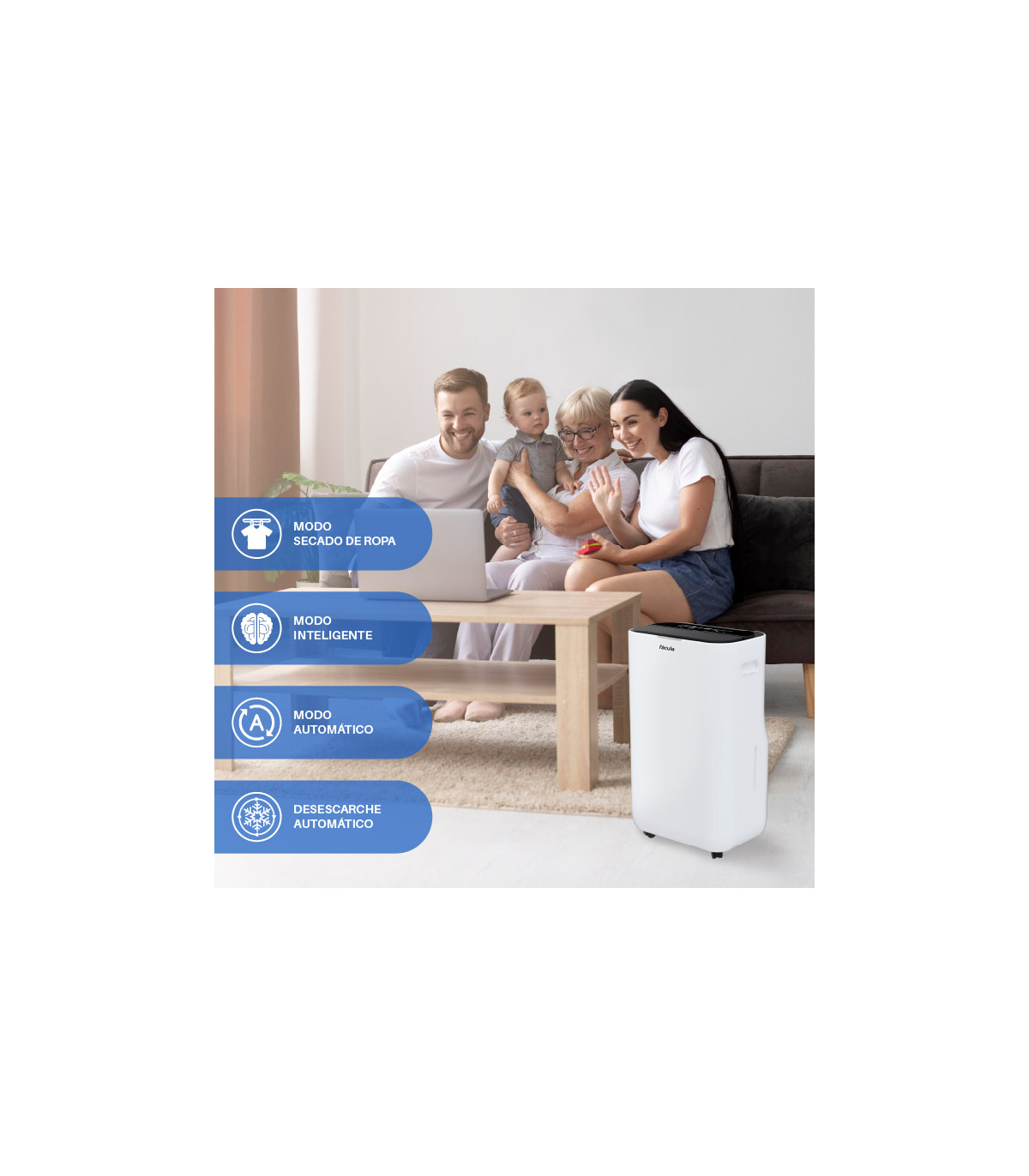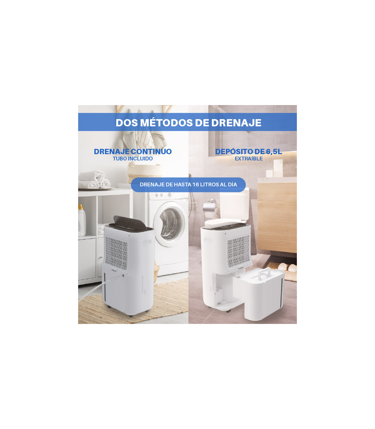 Deshumidificador portátil con drenaje continuo, modo auto, temporizador, filtro lavable, pantalla LED y gas R290. Silencioso, compacto y fácil de mover.