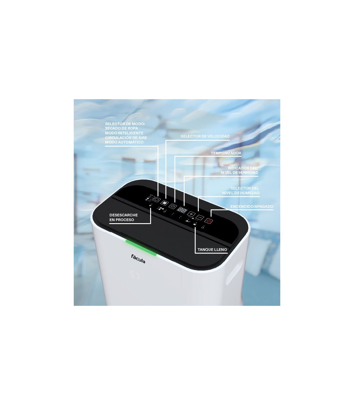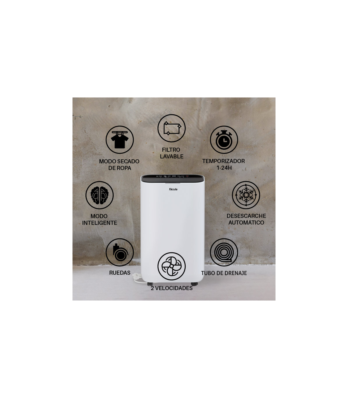 Fácula - Deshumidificador Siroco 16 l/día | Control Inteligente | Depósito extraíble 3,2l | Secado de Ropa | Temp 1-24h Fácula - Deshumidificador Siroco 16 l/día | Control Inteligente | Depósito extraíble 3,2l | Secado de Ropa | Temp 1-24h