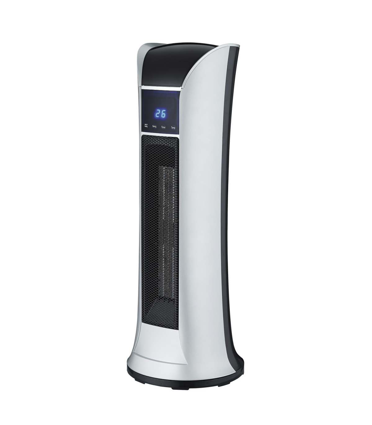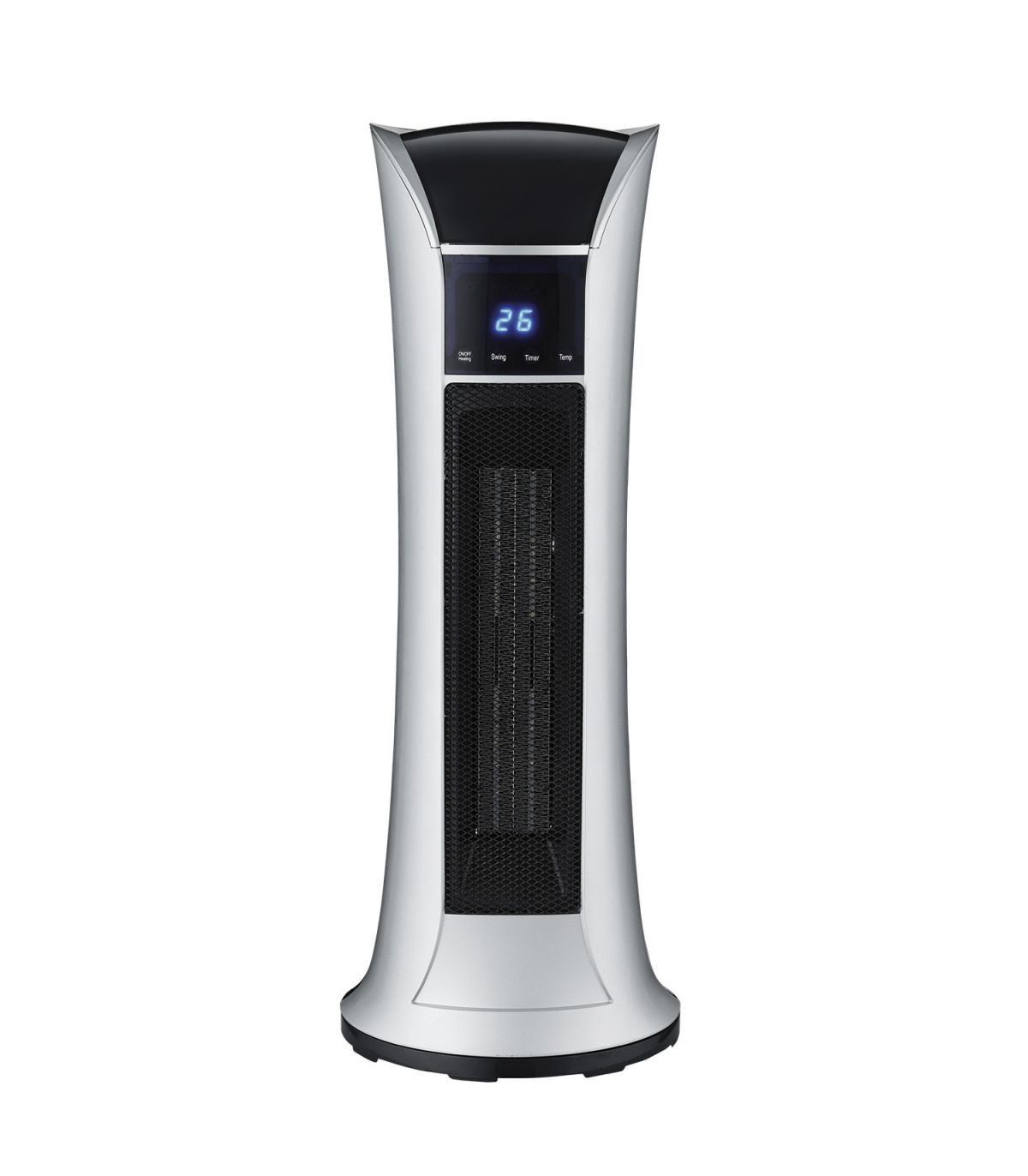 Termoventilador con tecnología PTC de torre, diseño clásico, control de temperatura, 2 velocidades, temporizador 12h, panel de control táctil y control remoto incluido.