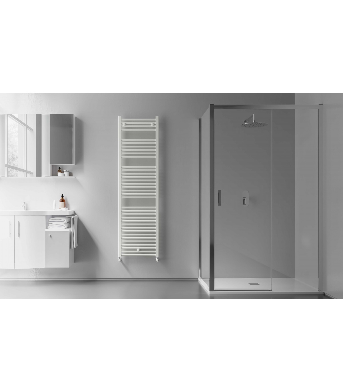Radiador toallero de agua blanco con bastidor de acero al carbono. Mantiene toallas y baño cálidos. Requiere instalación a la calefacción cental.
